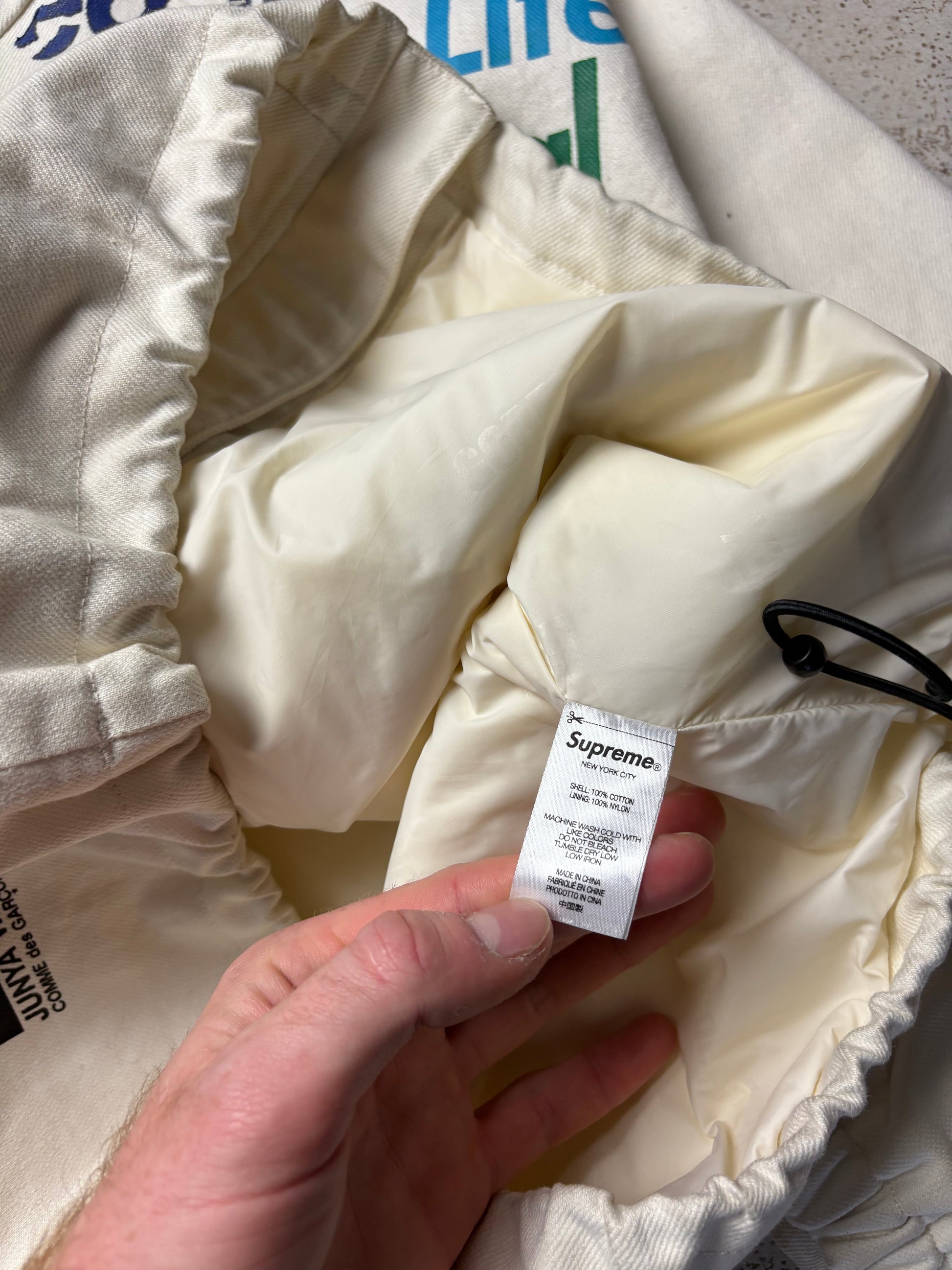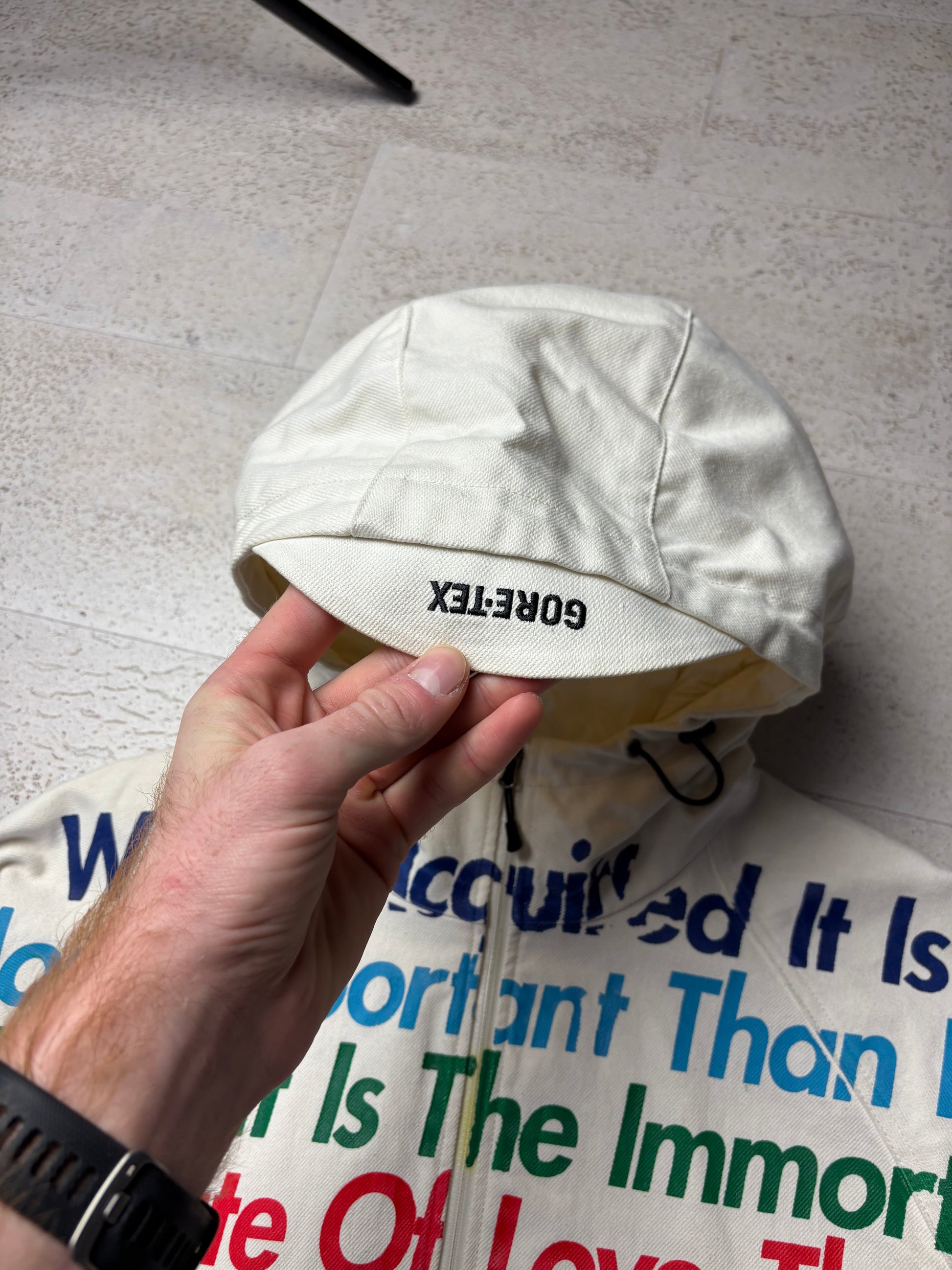 Cream colourway with text to chest- featuring a Gore-tex layered denim material - Rare!